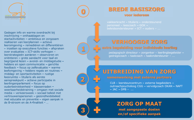 In de fase van de verhoogde zorg krijgt de leerkracht de hulp van schoolinterne begeleiders en beleidsondersteuners. Op SJB hebben we heel wat experts: de taalcoördinatoren die taalbevorderende projecten ontwikkelen en realiseren, de leerlingbegeleiders die focussen op het leerproces of ondersteuning bieden voor het welbevinden en de gedragscoaches die aandacht hebben voor het duurzaam samenleven op onze school. In deze fase werkt het CLB vooral adviserend en informerend.